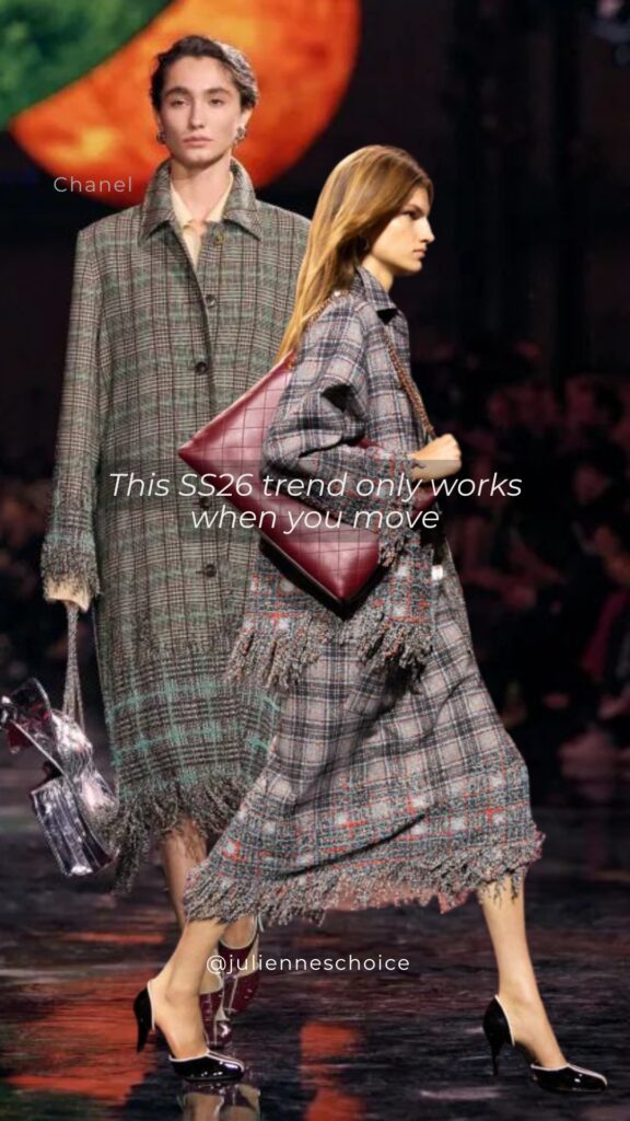 Fringe detailing gains renewed relevance in SS26 through motion. On the runway, these garments come alive only when the body moves. Fringes are placed to emphasize walking, turning, and airflow, making movement itself part of the design language. It is one of the most kinetic trends of the season.