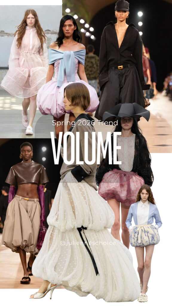 SS26 moves decisively away from narrow silhouettes. Puff skirts, balloon pants, and sculptural volume redefine proportion across collections. Crucially, this volume is controlled. Lightweight fabrics and strategic construction prevent heaviness, allowing garments to feel bold yet wearable in motion.